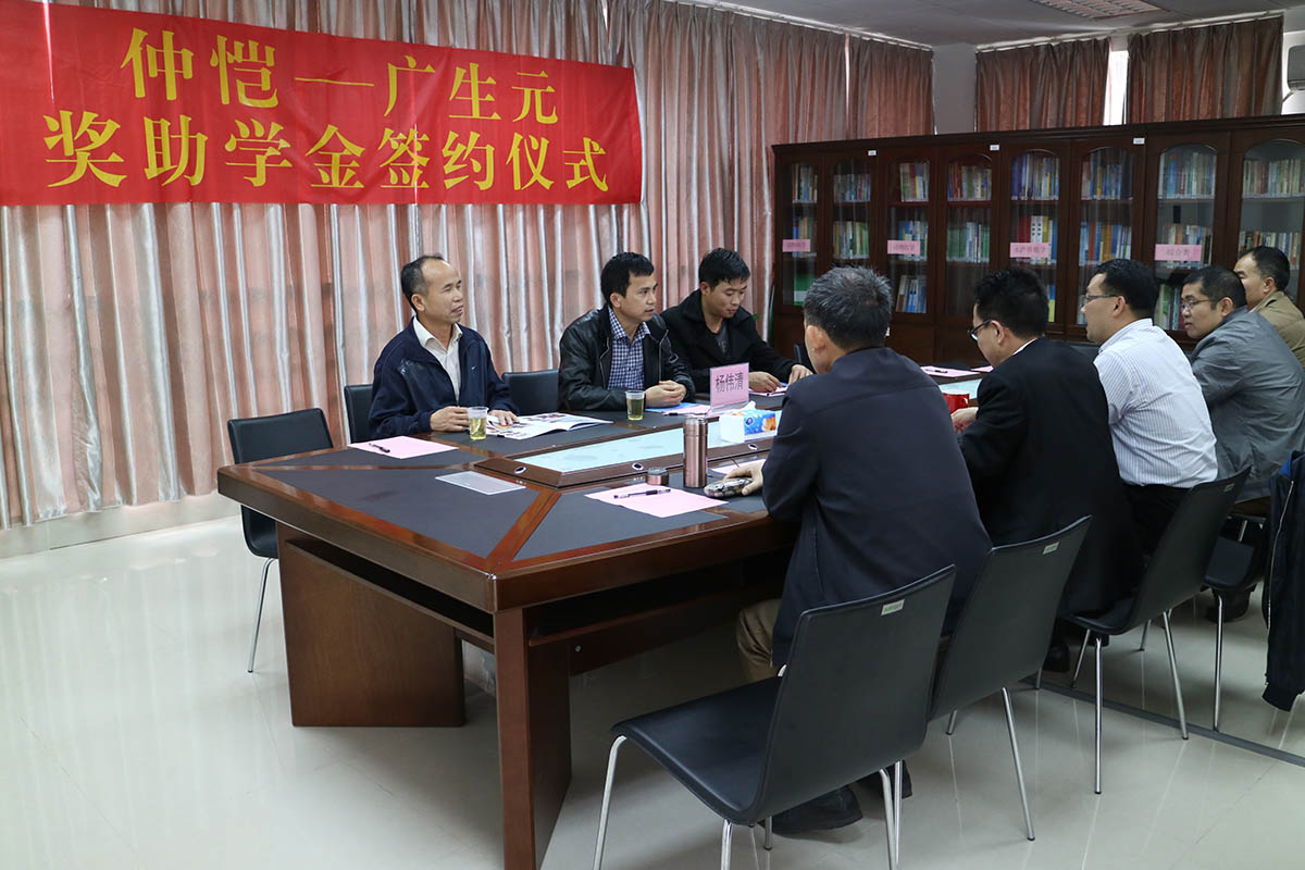 3月23日下午15:00,“仲恺-广生元”奖助学金签约仪式在beat365官网白云校区刘宇新楼325会议室顺利举行。广东广生元畜牧发展有限公司总经理杨伟清及其公司代表,学校副校长田允波、动科院党总支书记曾献尼、副院长赵钢、黄运茂及部分教师,出席签约仪式。仪式由曾献尼书记主持。
