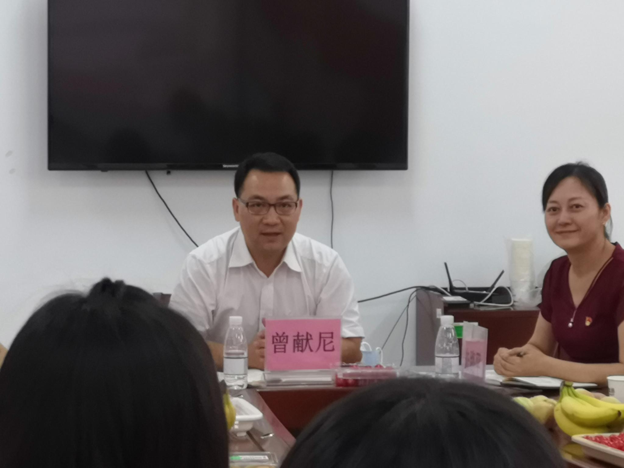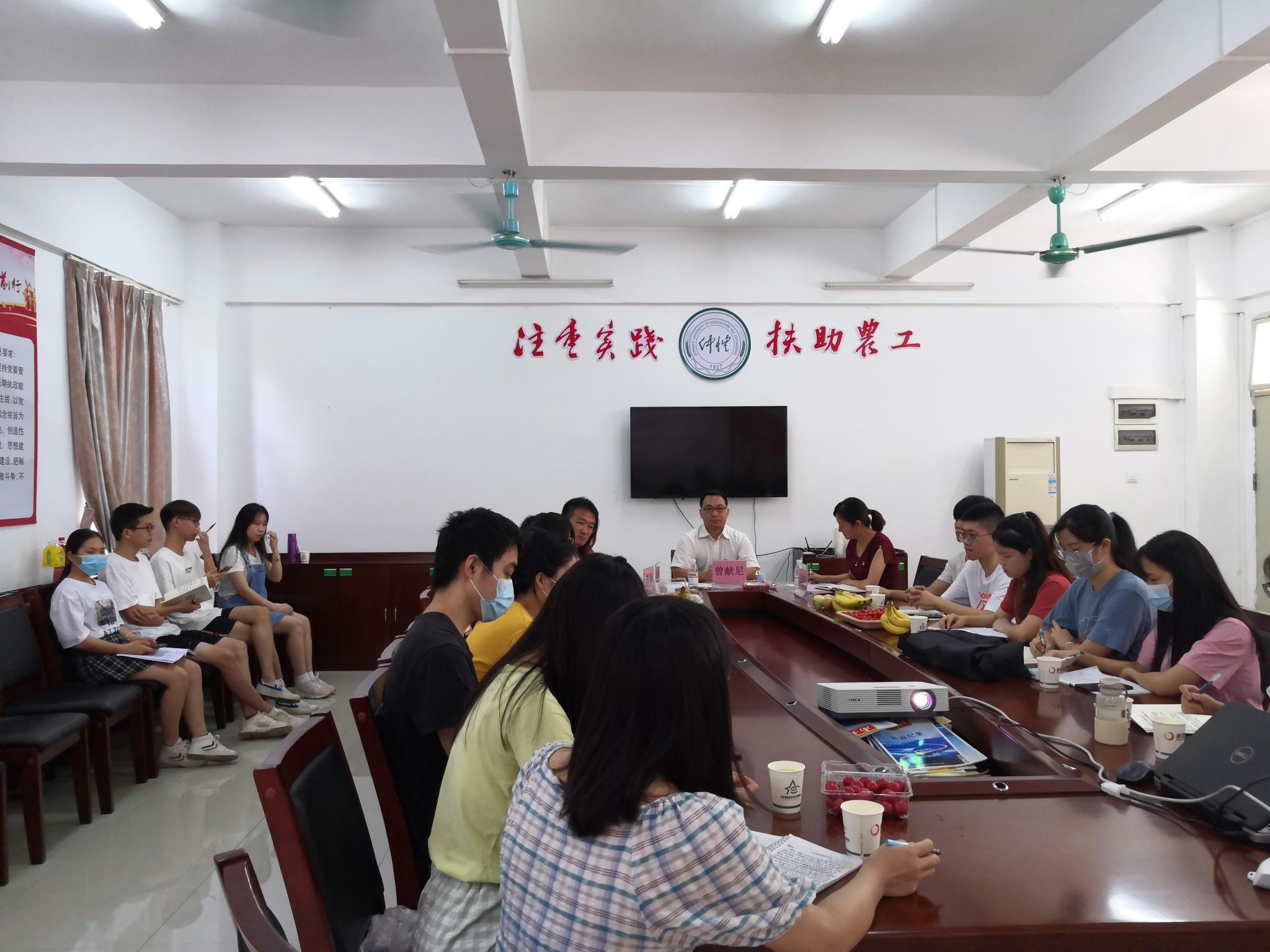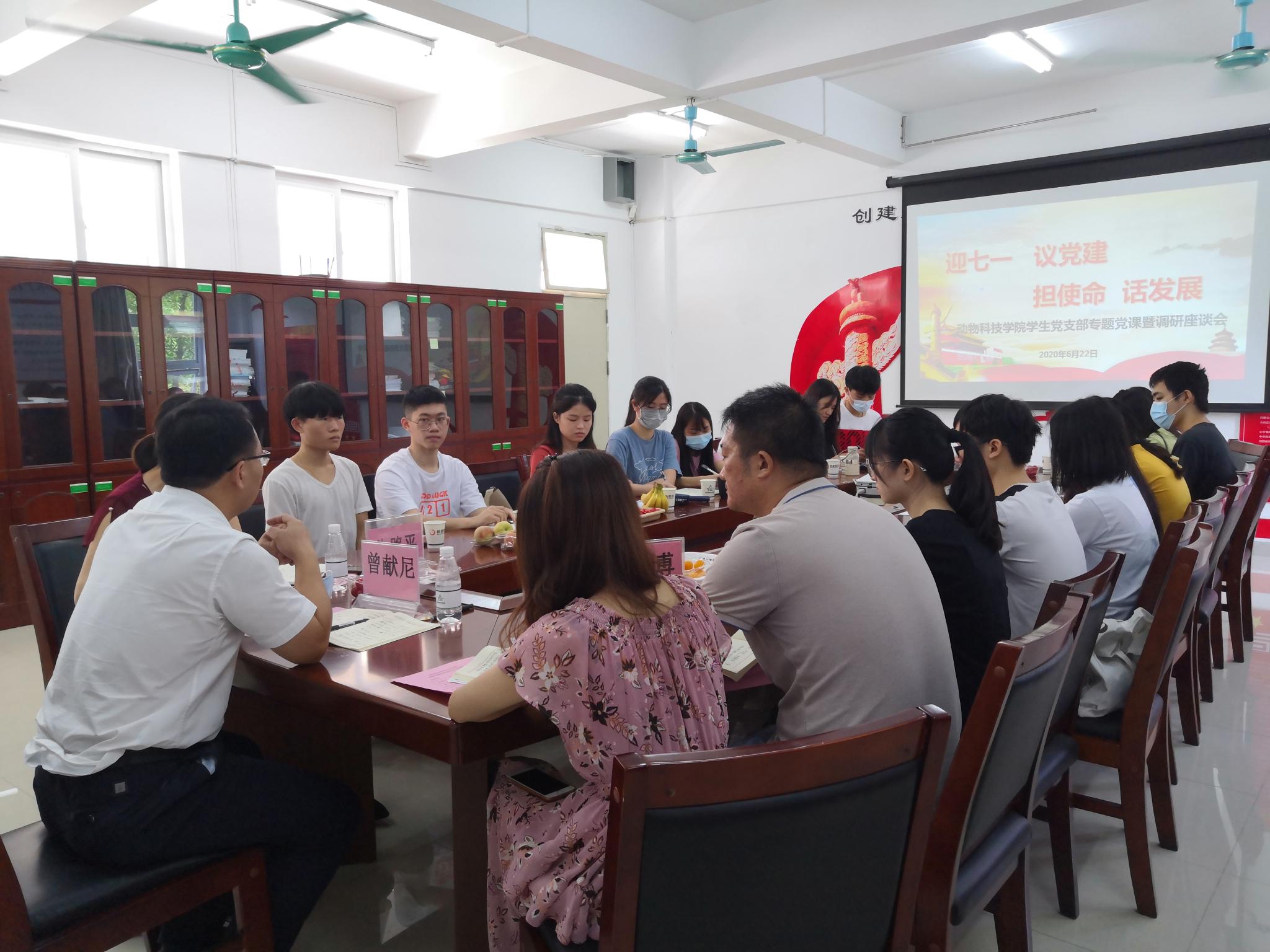 6月22日上午,学校党委常委、党委宣传部、党委统战部部长曾献尼来到白云校区,参加beat365在线唯一官网学生党支部“迎七一、议党建、担使命、话发展”调研座谈会并讲授专题党课。动科院党总支副书记朱路平、学生党支部书记许鸿、辅导员李博和19名学生党员代表参加了会议。