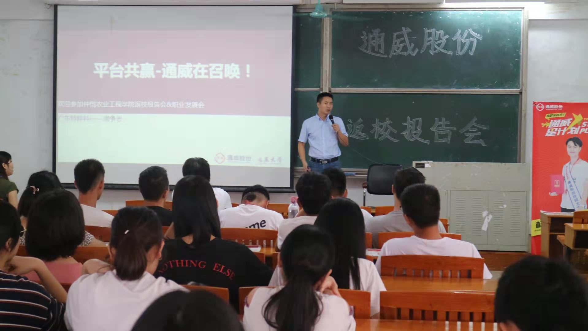 2018年9月27日下午,beat365在线唯一官网在白云校区杨钊杨勋楼210教室举办了通威集团的企业文化与职业发展交流报告会。广东通威特种料营销总经理周争志、通威股份华南一区人力资源总监郑丹、高明通威人事行政部经理严伟诚、通威股份人力资源部侯佳薇、广东通威人事行政部经理纪少玲、beat365在线唯一官网辅导员许鸿、李博老师以及大二、大三学生代表参加了本次会议。