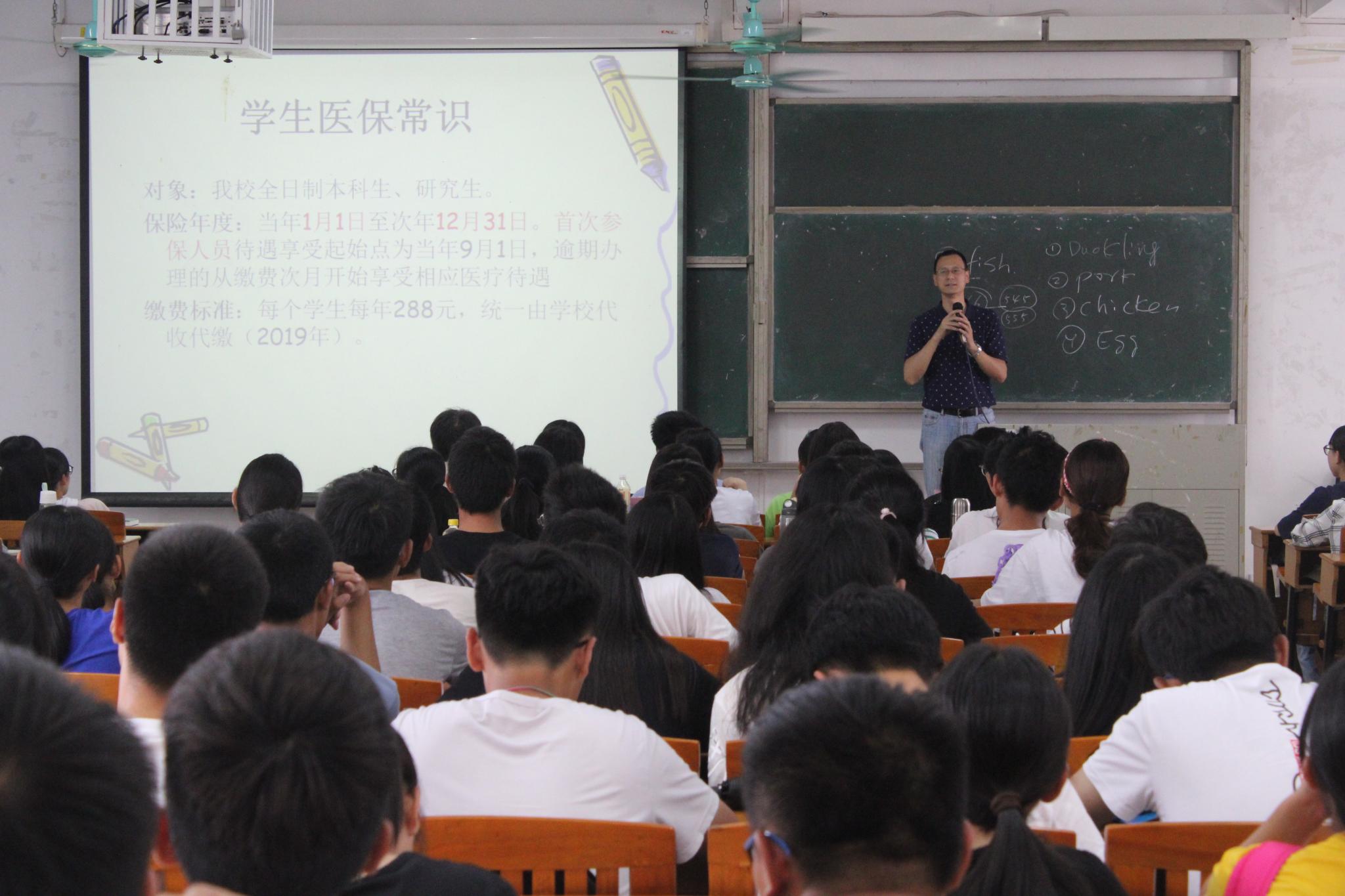 首先,刘院长向新生解读了大学生参加城乡居民医疗保险的意义、就医报销流程、报销额度、定点医院等医保相关政策。并与在场学生互动,对学生日常生活息息相关的医保问题进行了一一解答。