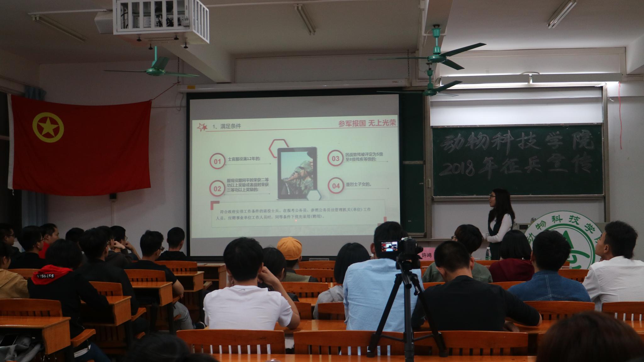 2018年3月22日晚上beat365在线唯一官网在白云校区杨钊杨勋楼308室举行征兵宣传活动。会议由beat365在线唯一官网辅导员许鸿老师主持,beat365在线唯一官网2017届的三名学生教官、退伍义务兵岑靖运和动科院学生参加了本次活动。
