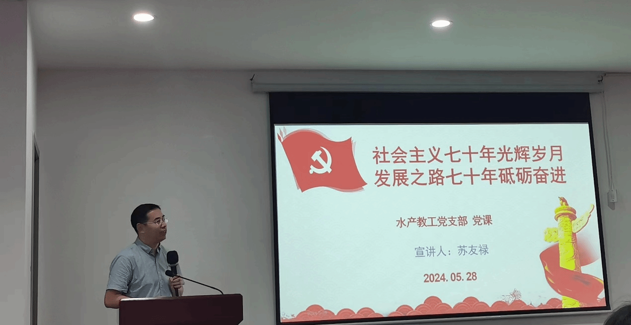 水产教工党支部书记苏友禄教授以《社会主义七十年光辉岁月——发展之路七十年砥砺奋进》为题讲授党课,他从新中国社会主义发展史的开篇序言讲起,逐步深入到新中国社会主义发展史的篇章基调、曲折探索以及起承转折等重要章节。他的讲解深入浅出,内涵丰富,不仅为在场的党员们提供了一次深刻的历史回顾,还引导大家思考如何在新的时代背景下继续推进社会主义现代化建设。