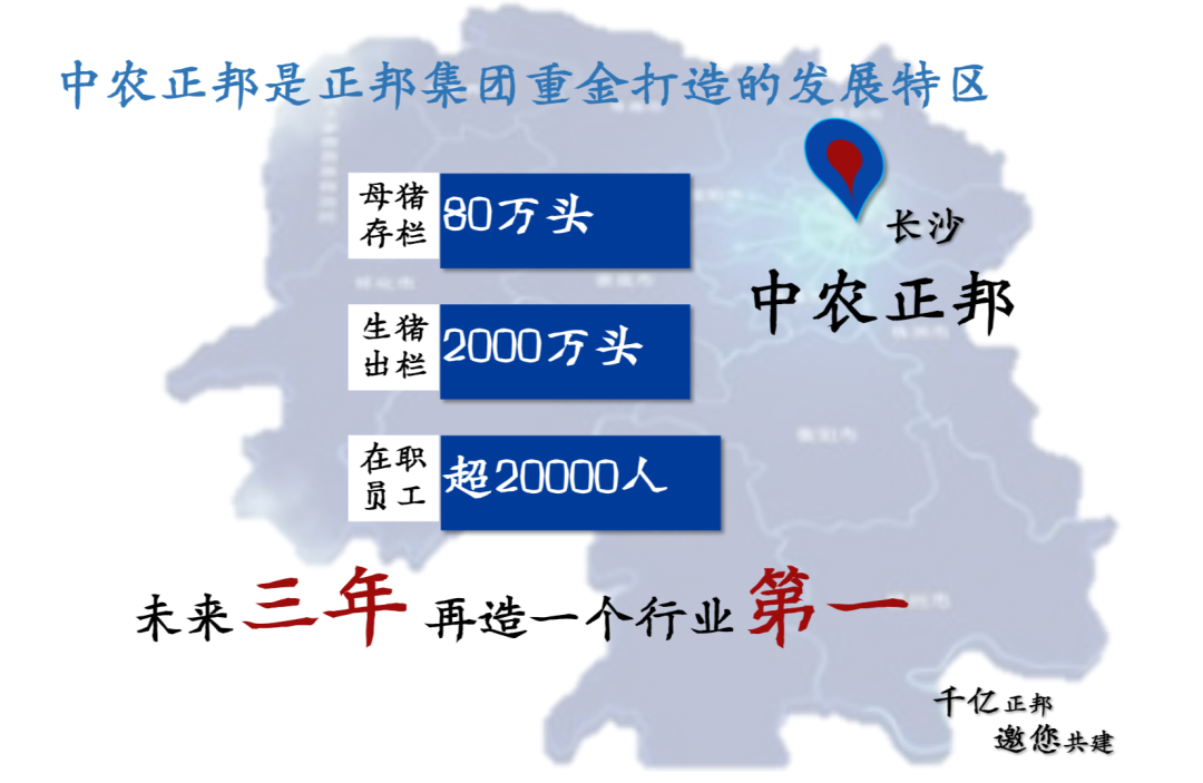 为响应国家农业部号召,正邦集团决定重金打造经济特区——中农正邦,实现未来三年母猪存栏80万头,生猪出栏2000万头,在职员工超20000人,再造行业第一的宏伟目标。中农正邦总部位于湖南长沙,拥有常德、邵阳、湘东、湘南、湘西、粤西及海南七个大区,背靠湖广、覆盖云贵、瞭望海峡,蕴含极大发展潜力。